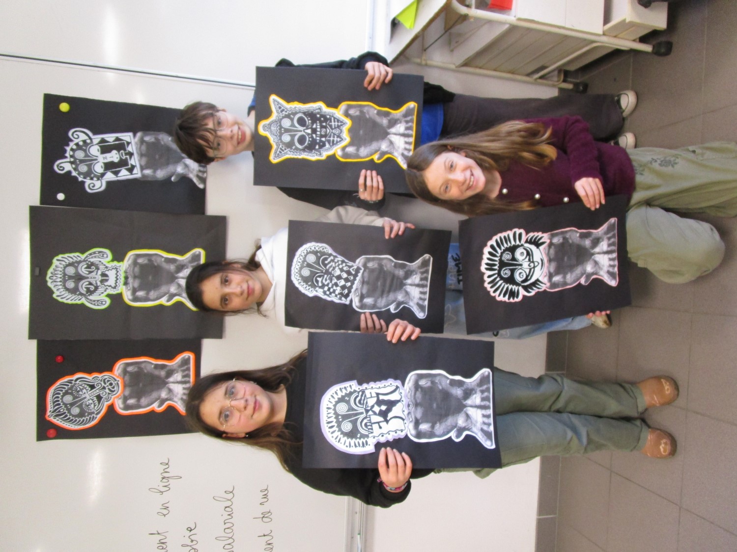 Ce travail en encre de Chine (encre indienne en anglais) est basé sur un motif malien. Les élèves ont pris de l’inspiration dans toutes sortes de traditions de tatouages du monde entier, apportés de la collection de l’association artyculture de Santec.